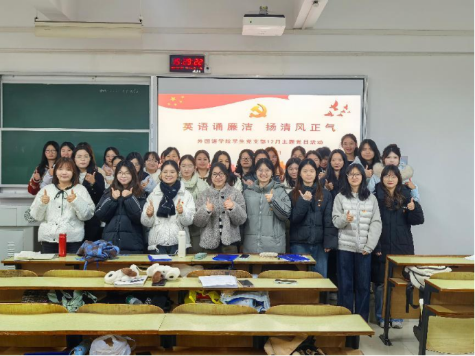 为推动党的二十届四中全会精神落地生根,扎实推进“清廉湖工”建设,12月23日下午,外国语学院学生党支部在教学楼C栋202教室组织开展“英语诵廉洁 扬清风正气”十二月主题党日活动。支部全体党员齐聚一堂,以专业实践践行初心使命。