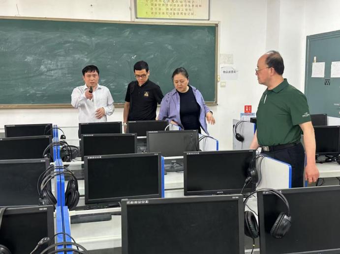 2025年4月15日上午,湖南警察学院基础课部袁华平主任、廖文丽书记、实验管理中心张岳健老师一行人来我院调研实验室建设情况。首先,外国语学院主管实验室建设工作的吴斐副院长对袁主任等人的到来表示欢迎。然后,吴斐及负责实验室管理的周子琬、陈之遥老师带袁主任等人先后参观了外语沉浸式智慧语言实训中心、同声传译实验室、商务英语情景实训室、大学英语自主学习中心、翻译与认知中心等实验室。
